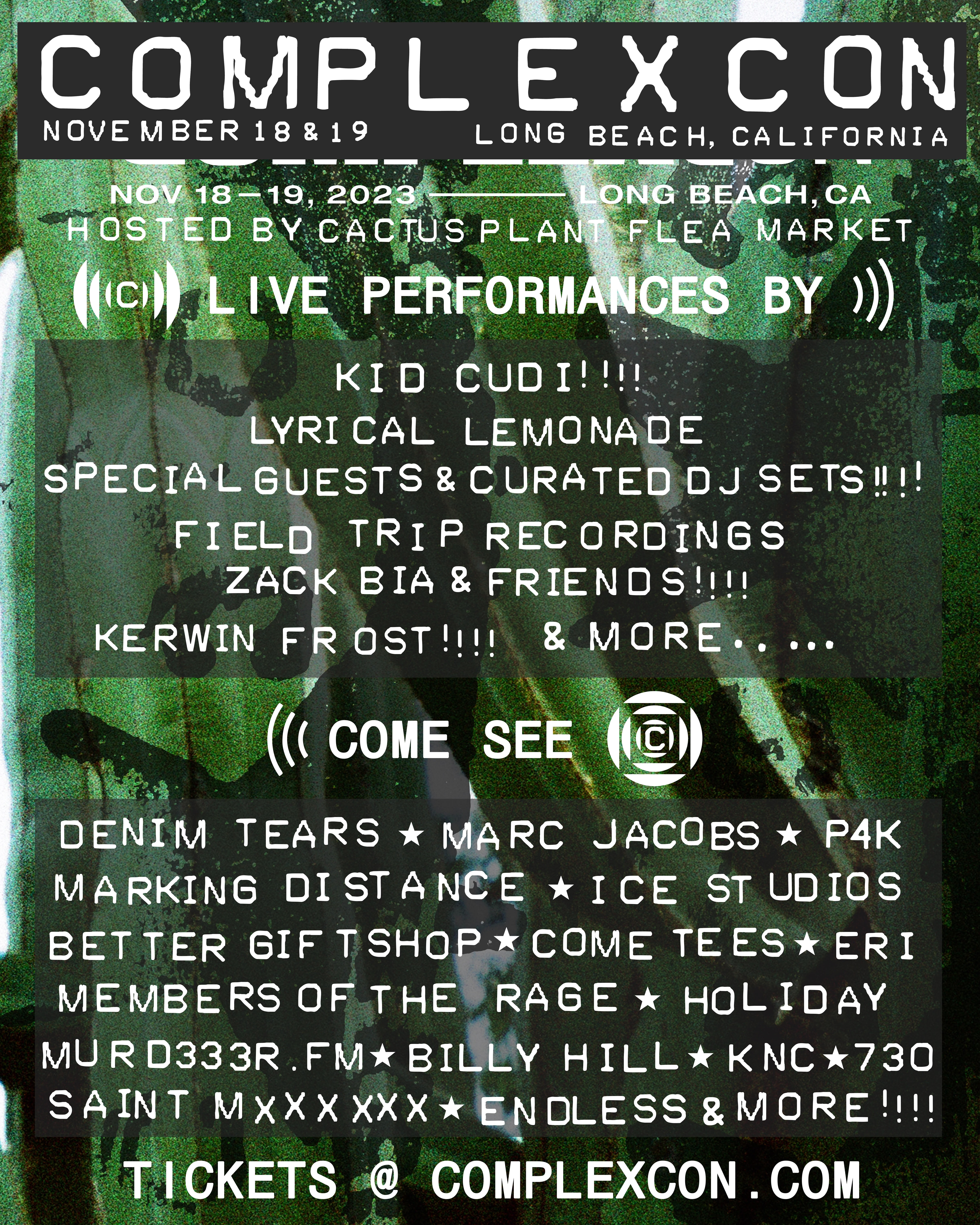 Additional performances from Field Trip Recordings with Zack Bia & Friends, Kalan.FRFR, Kerwin Frost, Luh Tyler, Lyrical Lemonade with special guests, and more CACTUS PLANT FLEA MARKET adds Denim Tears, Marc Jacobs, Members Of The Rage, KNC Beauty, Marking Distance, Ice Studios, and more to marketplace brandsat ComplexCon this November 18-19 in Southern CaliforniaComplexCon is a groundbreaking festival and exhibition that brings together pop culture, music, art, food, sports, innovation, activism, and education. Guests in attendance will be able to shop hundreds of exclusive releases from the most sought-after brands, watch inspiring talks from the most influential minds in our culture, and experience the future through the most immersive and ambitious pop culture experience yet. ComplexCon announced the initial performance lineup for the 7th annual festival and marketplace taking place November 18-19 at the Long Beach Convention Center. GRAMMY award-winning, multi platinum artist and producer Kid Cudi will serve as this year’s headliner performing on Sunday, November 19, capping off the two-day convergence of pop culture, music, art, food, sports, innovation, activism, and education. This is Kid Cudi’s second year headlining ComplexCon following his electric debut in 2019.ComplexCon will kick off its musical programming on Saturday, November 18 with Field Trip Recordings with Zack Bia & Friends providing buzzworthy performances and DJ sets for attendees throughout the day. Ahead of Kid Cudi’s headlining Sunday night performance, Kalan.FRFR, Kerwin Frost, and Luh Tyler will take the stage at the Long Beach Convention Center. Also on Sunday, celebrating their 10-year anniversary this year, Lyrical Lemonade will curate DJ sets and additional special guests, with more musical performers and celebrity panelists to be announced soon. In addition to this year’s performances, ComplexCon 2023 Artistic Director CACTUS PLANT FLEA MARKET has invited friends and favorite brands and artists to the ComplexCon marketplace, including Denim Tears, Marc Jacobs, P4K, Luka Sabbat’s Marking Distance, Renell Medrano’s Ice Studios, Better Gift Shop, Come Tees, MERMAIDHAIR, Kid Cudi’s Members Of The Rage, holiday®, Bloody Osiris’ Murd333r.FM, Billy Hill, KNC Beauty, 730, Saint MXXXXXX, and Endless. CACTUS PLANT will also be creating an exclusive capsule for the ComplexCon Gift Shop. ComplexCon will once again bring together an exclusive selection of over a hundred pop-ups, art installations and branded activations to the show floor this November. Previously announced cult favorites will be debuting exclusive collaborations, launching new products and releasing limited drops worthy of camping out for. Stay tuned for more brand pop ups and exclusives to be announced soon.ComplexCon(versations) speaker series will also return and feature distinguished voices from across mediums that define what’s now and next in culture, including the much anticipated Sneaker Of The Year panel lead by Joe La Puma. As part of the epic festival experience, the First We Feast Lagoon will return in full force with the hottest, most delicious, “can’t-get-them-anywhere-else” dishes, hosts, and events from Hot Ones and First We Feast. VIP and general admission tickets are currently available at ComplexCon.com. For more information and to stay updated on the latest news, follow @complexcon on TikTok, Twitter and Instagram.